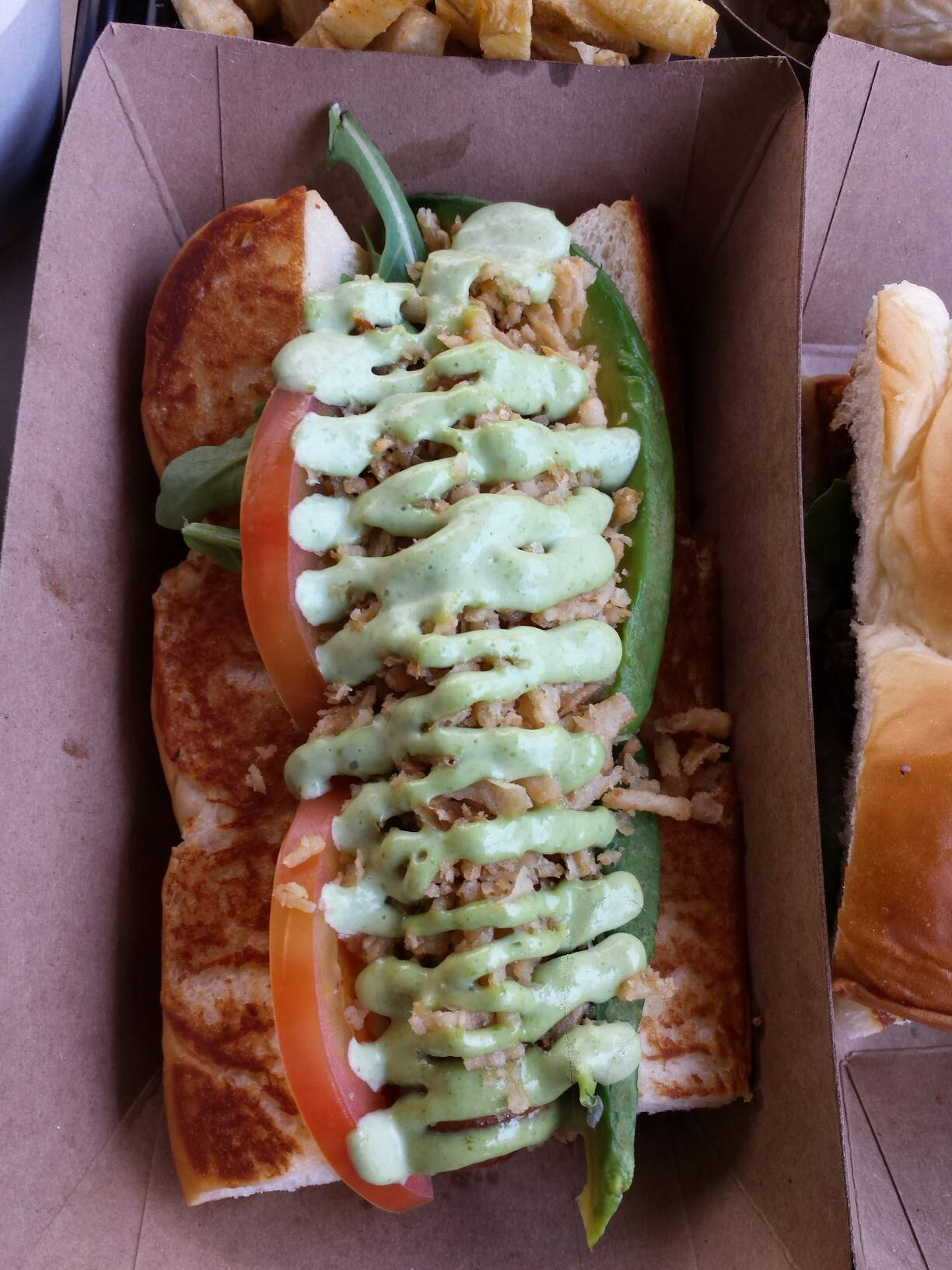 The “Sooo Cali” Dog has some classic SoCal flavors lying between those two signature Hawaiian bread buns. On this all-beef skinless dog, you’ll find fresh tomato and buttery avocado slices, along with an aromatic basil aioli and some fried onions for a nice crunch. This hot dog, being one of the originals since the first DogHaus location, has won awards from the likes of L.A. Weekly a couple years ago.